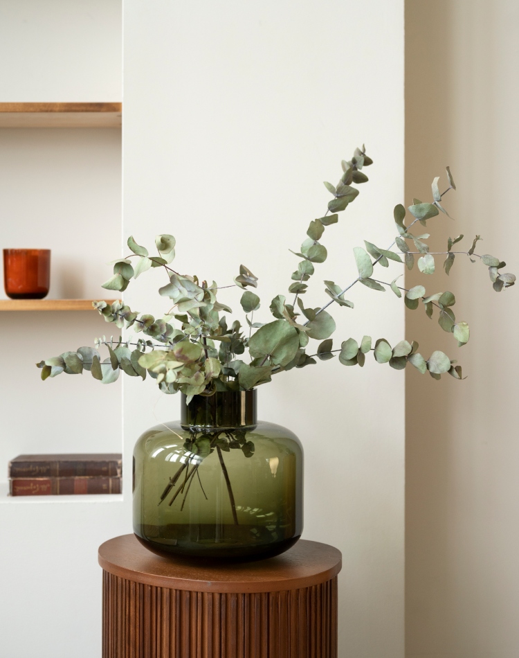 Zelenilo u vazama je maksimalno fleksibilno. Postavi ih na konzolu da dobiješ visinu, na policu da ublažiš oštre linije, na sto u providnoj vazi da pogledi „putuju“ kroz prostor ili čak na pod u XL vazi za efektnu scenu. Dva izdanaka eukaliptusa daju svežinu, tri monstere stvaraju wow efekat. I najbolje od svega – zelenilo se lako uklapa u bilo koju paletu boja i materijala: drvo, metal, staklo, keramika.