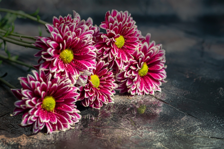 Prirodnog izgleda, nalik nasumično ubranom livadskom bilju, buket hrizantema uzgajanih na bilo koji način predočava nam svu suptilnost ovog cveta. Hrizanteme mogu biti predivne i delikante, a njihovo lišće crvenkaste boje predstavlja savršen dodatak različitim varijantama koje takođe poseduju pomalo skromne, ali veoma interesantne i lepe cvetove.